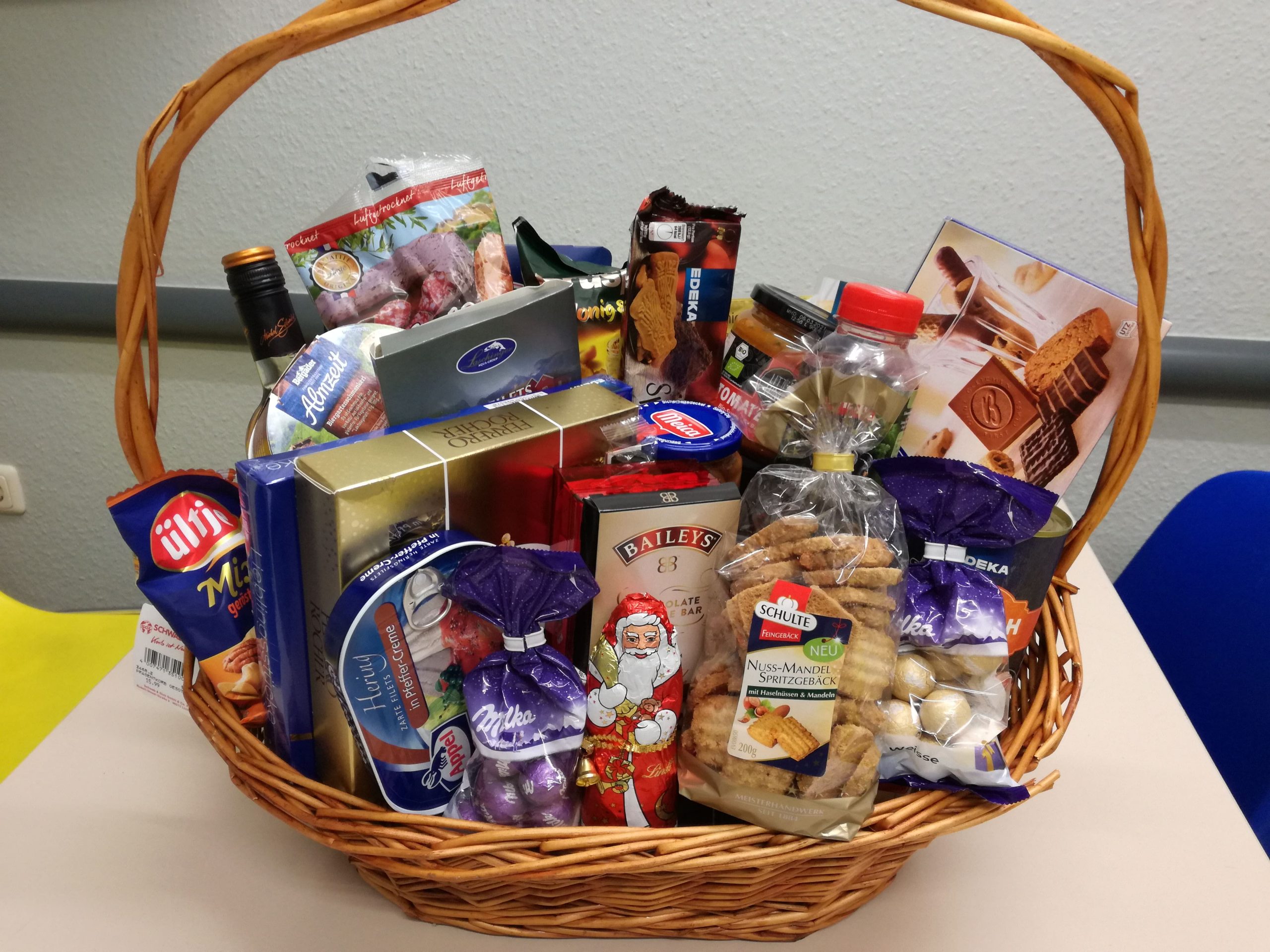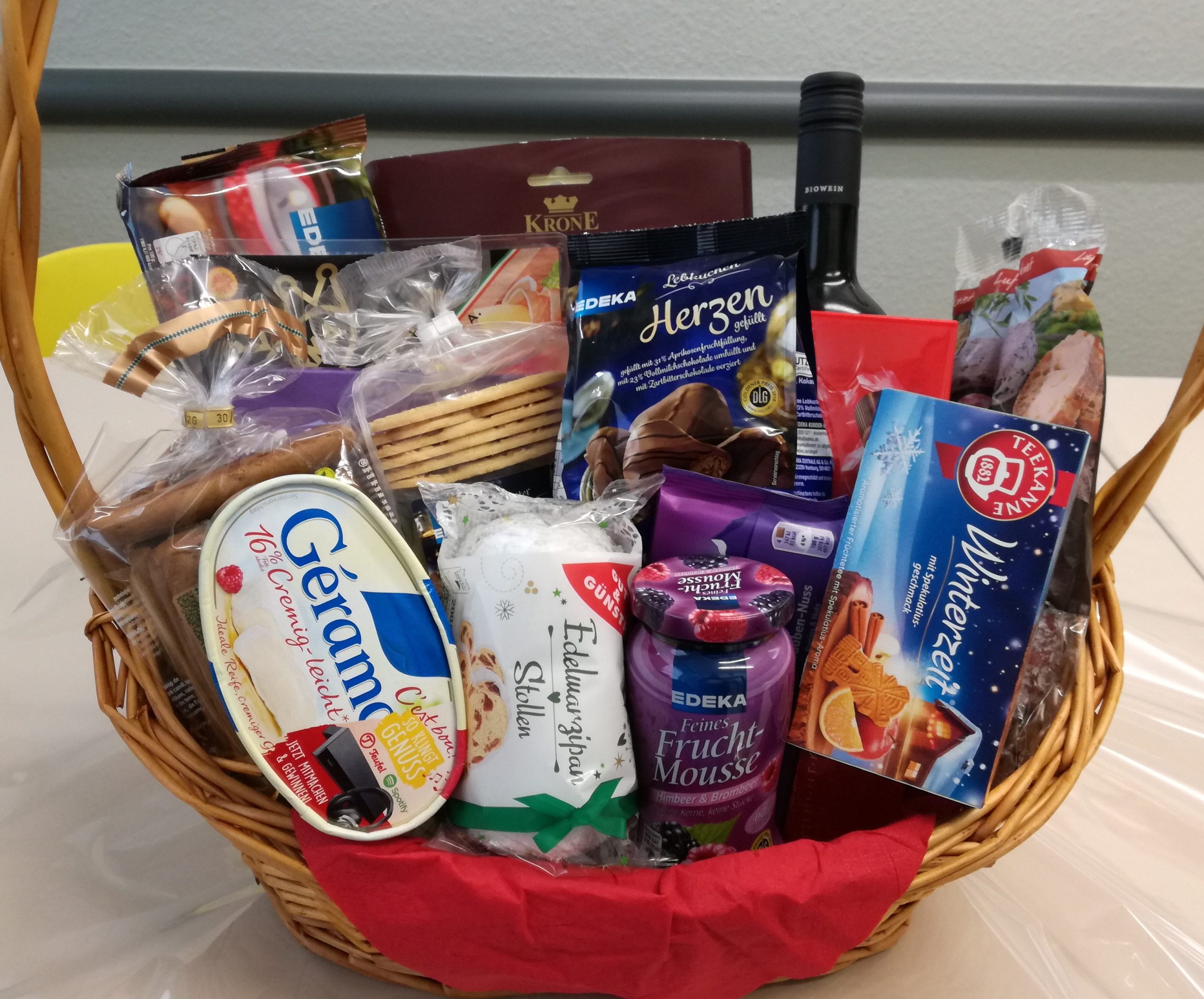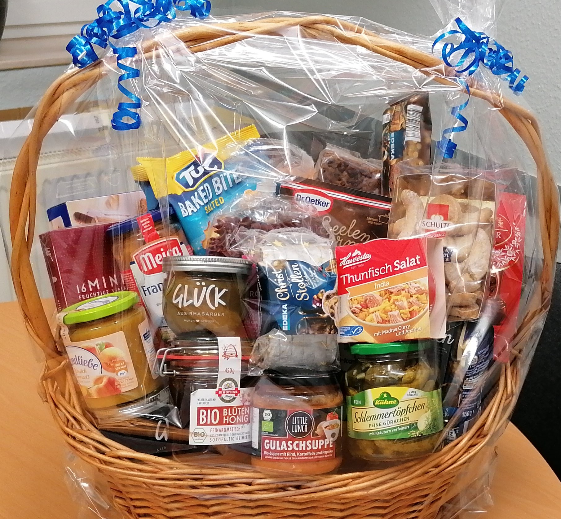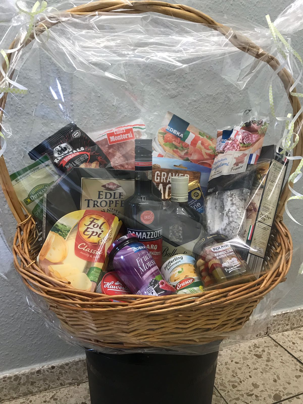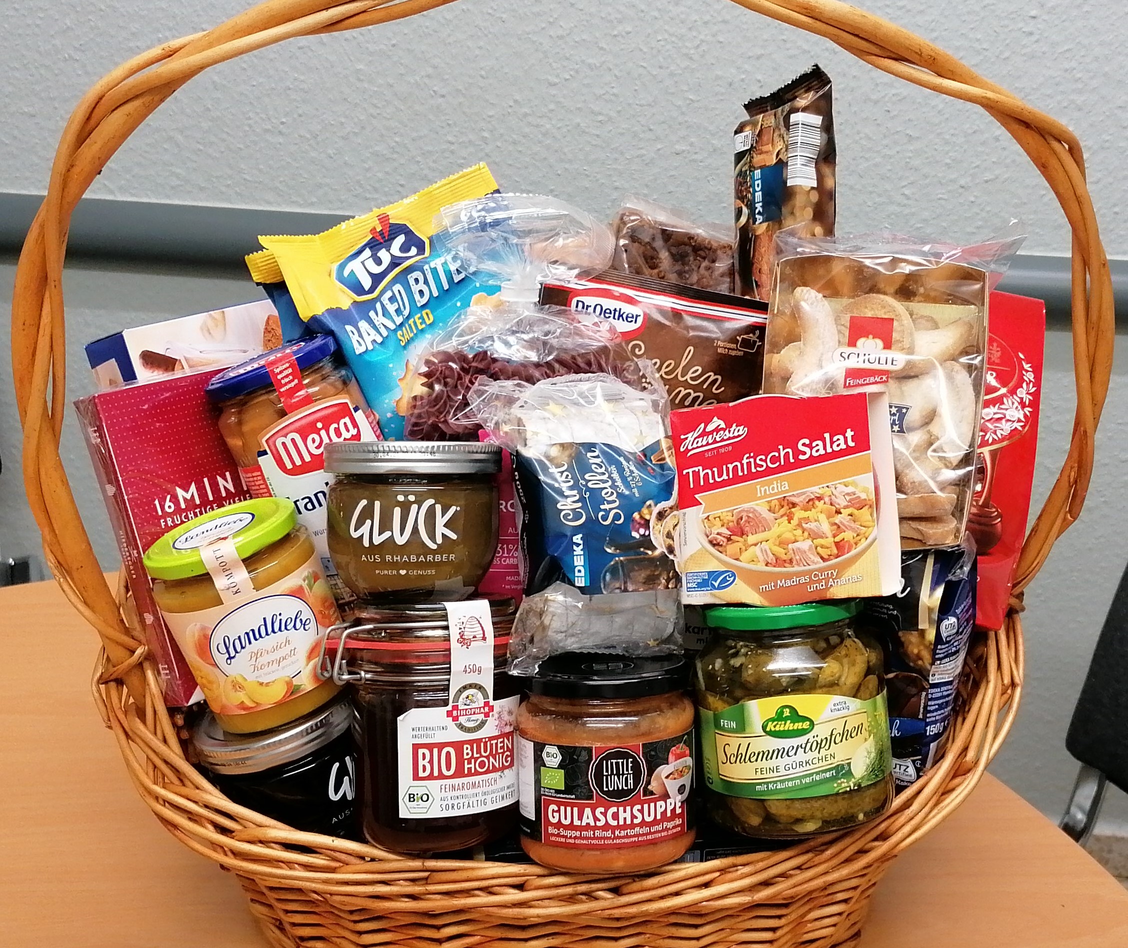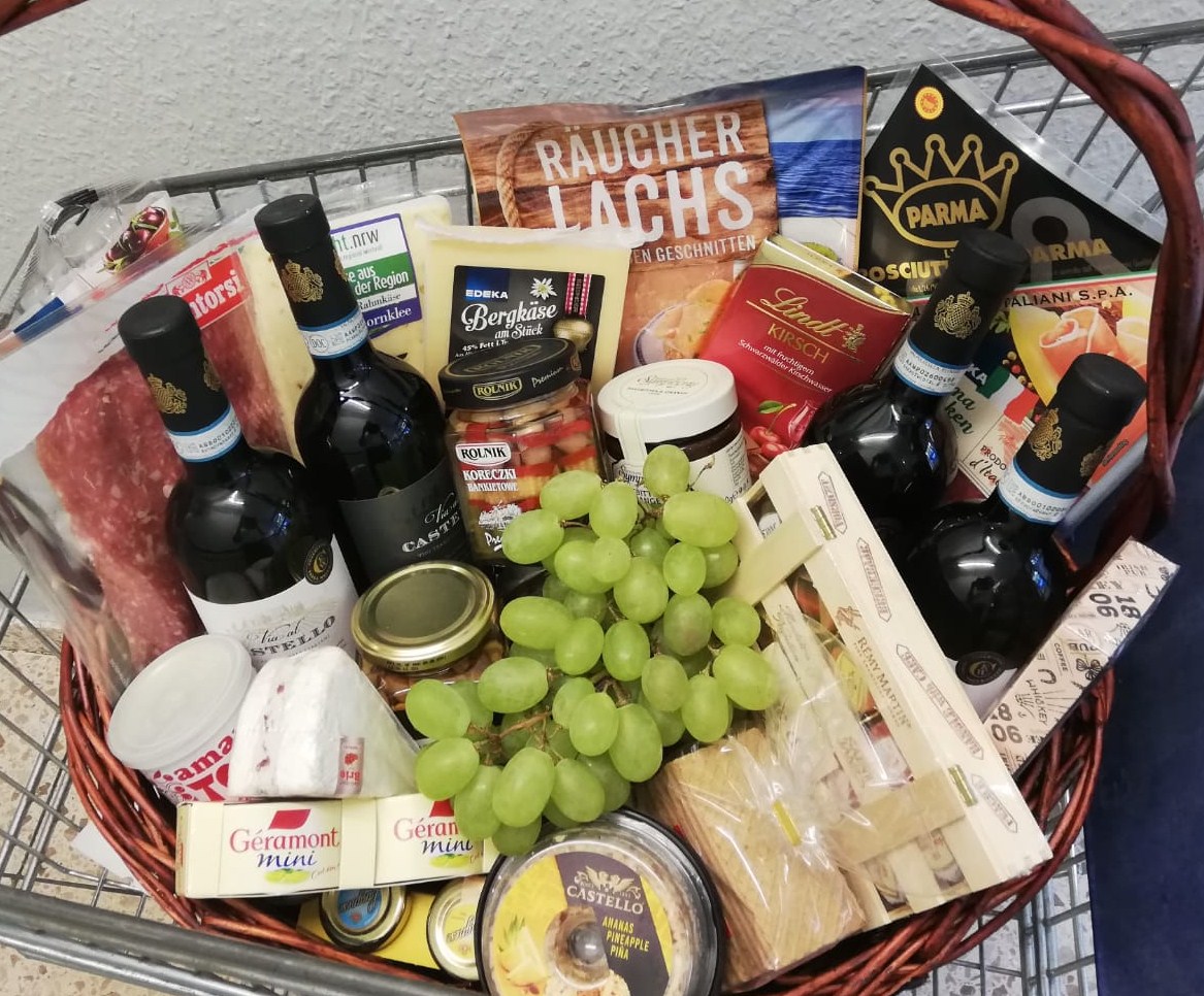 Sie nennen uns ein Thema, um das sich der Inhalt handeln soll und wir suchen aus unserem Sortiment entsprechende Produkte zusammen und dekorieren den Korb. Sie können ihn dann fix und fertig in Geschenkfolie verpackt bei uns abholen.