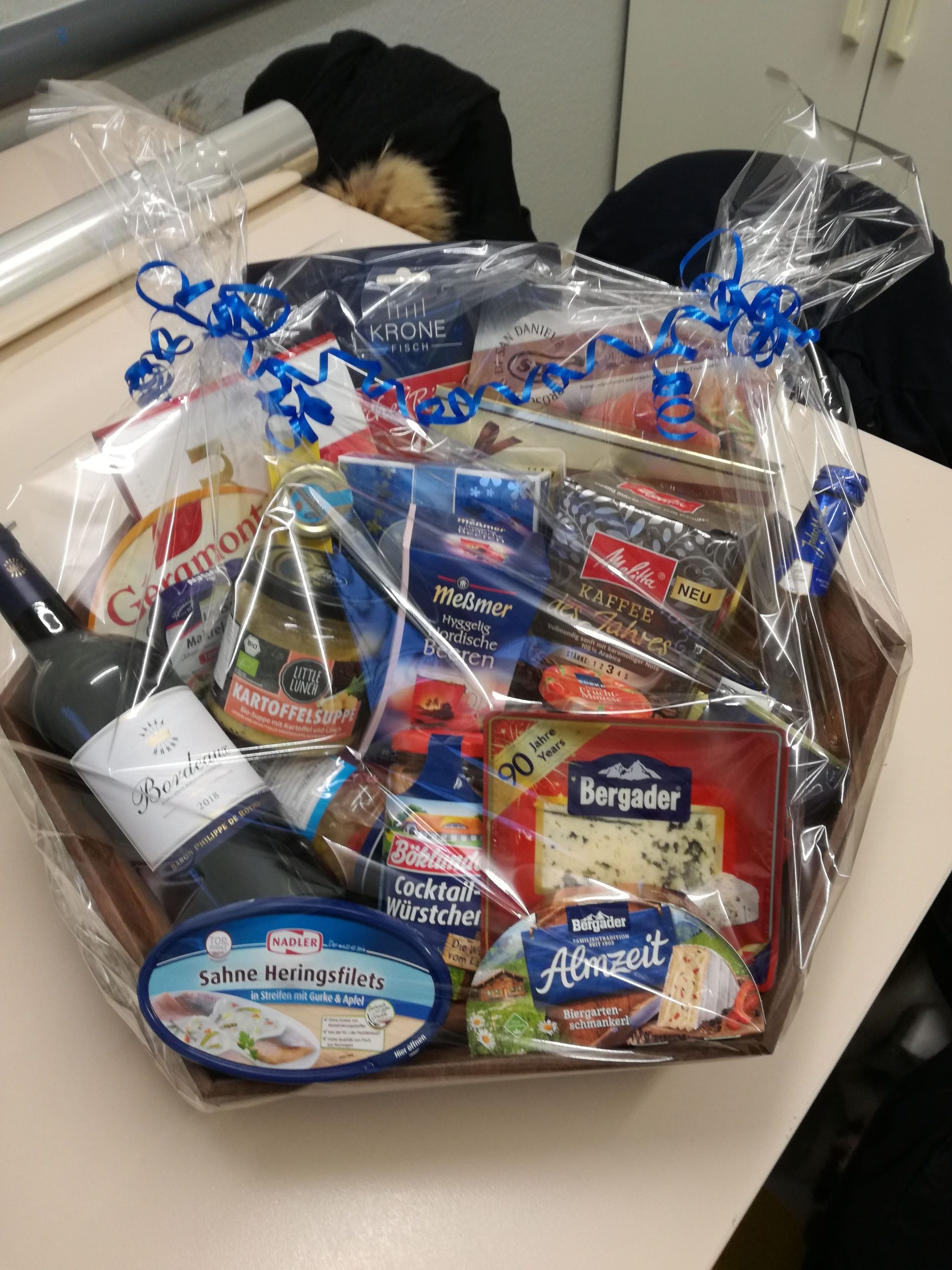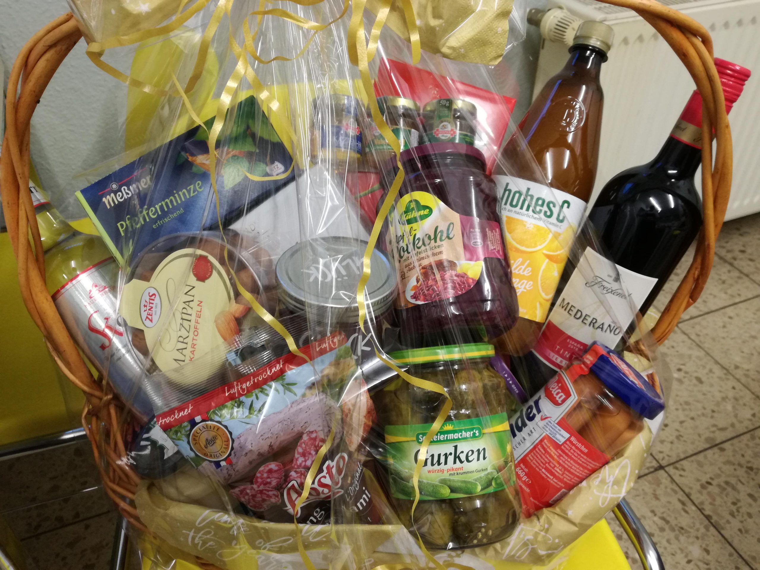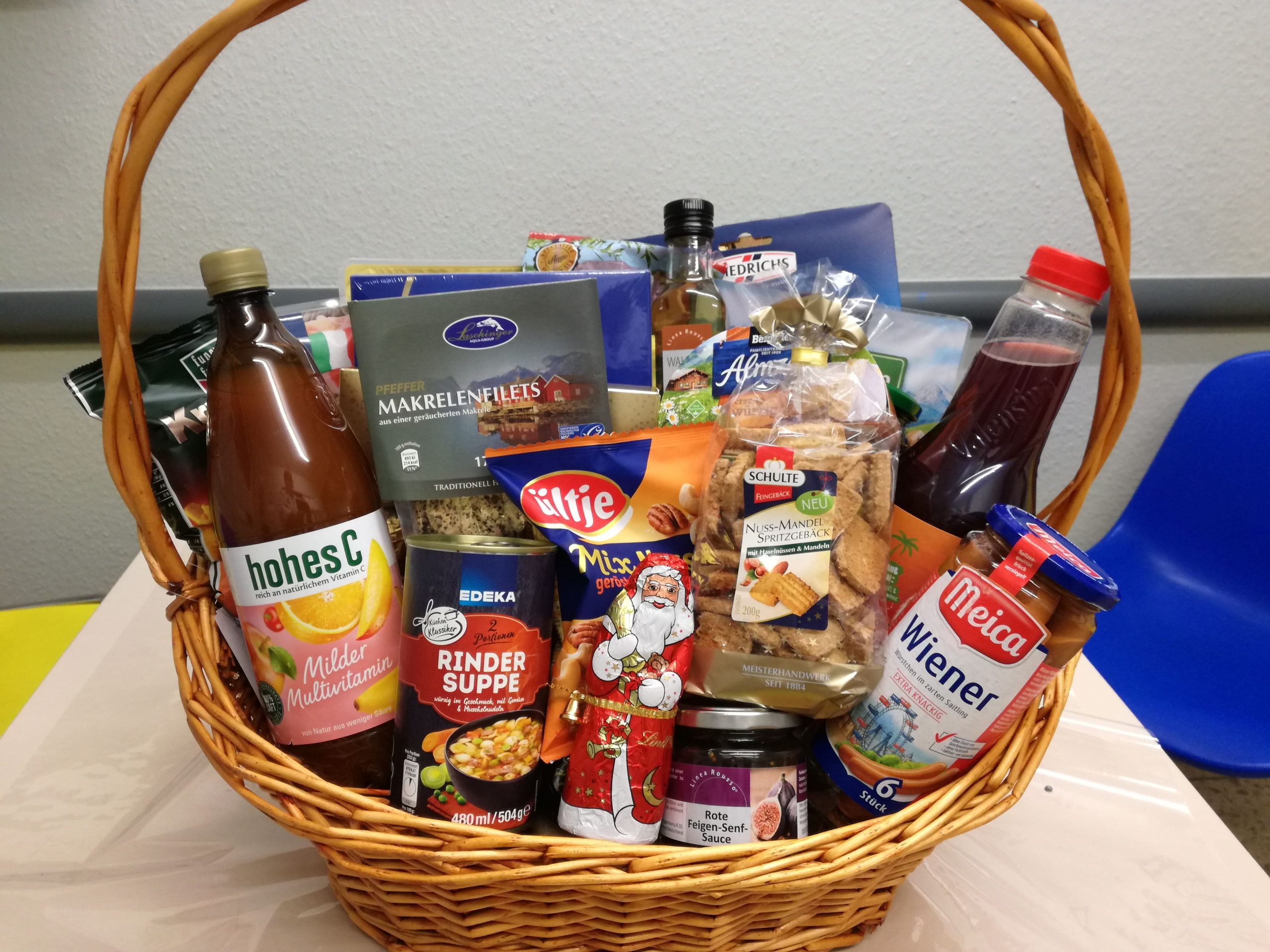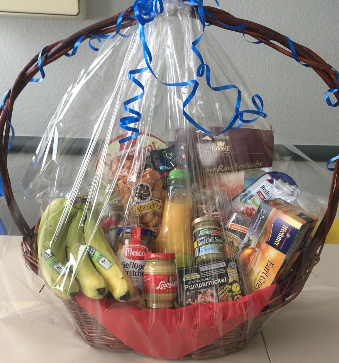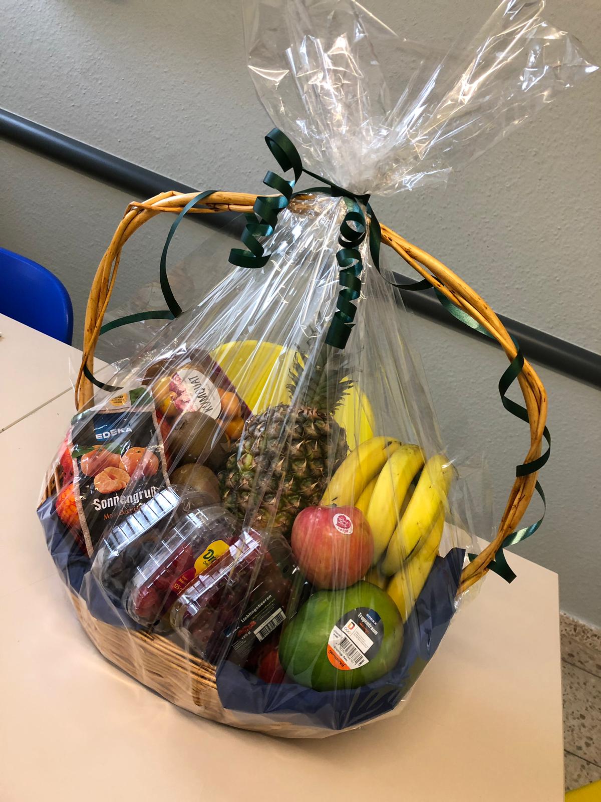 Sie nennen uns ein Thema, um das sich der Inhalt handeln soll und wir suchen aus unserem Sortiment entsprechende Produkte zusammen und dekorieren den Korb. Sie können ihn dann fix und fertig in Geschenkfolie verpackt bei uns abholen.