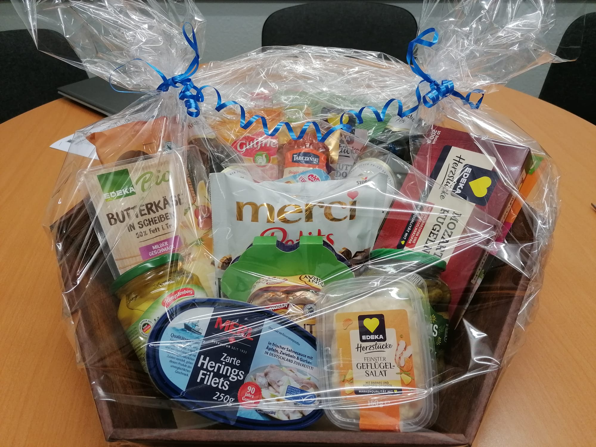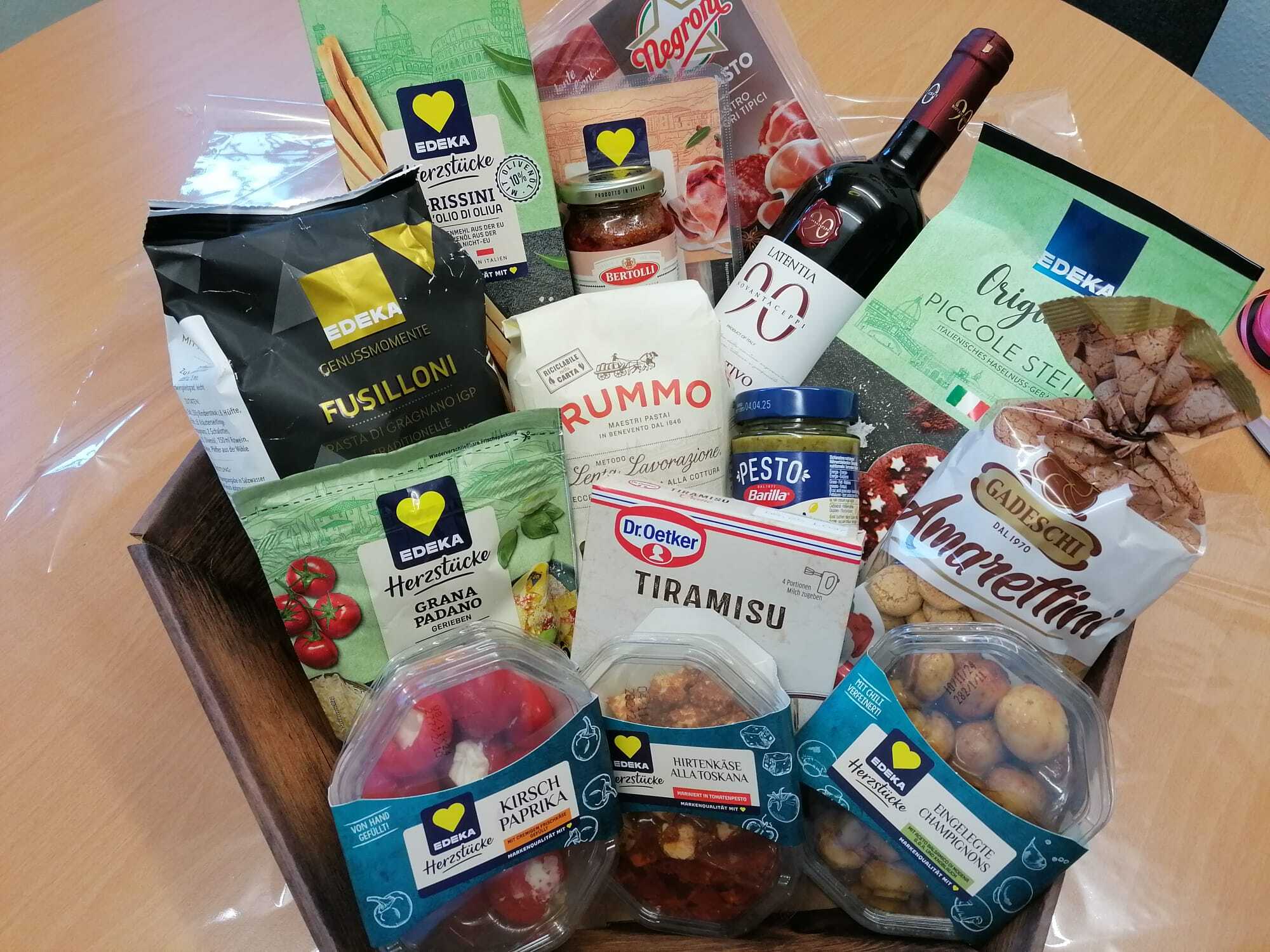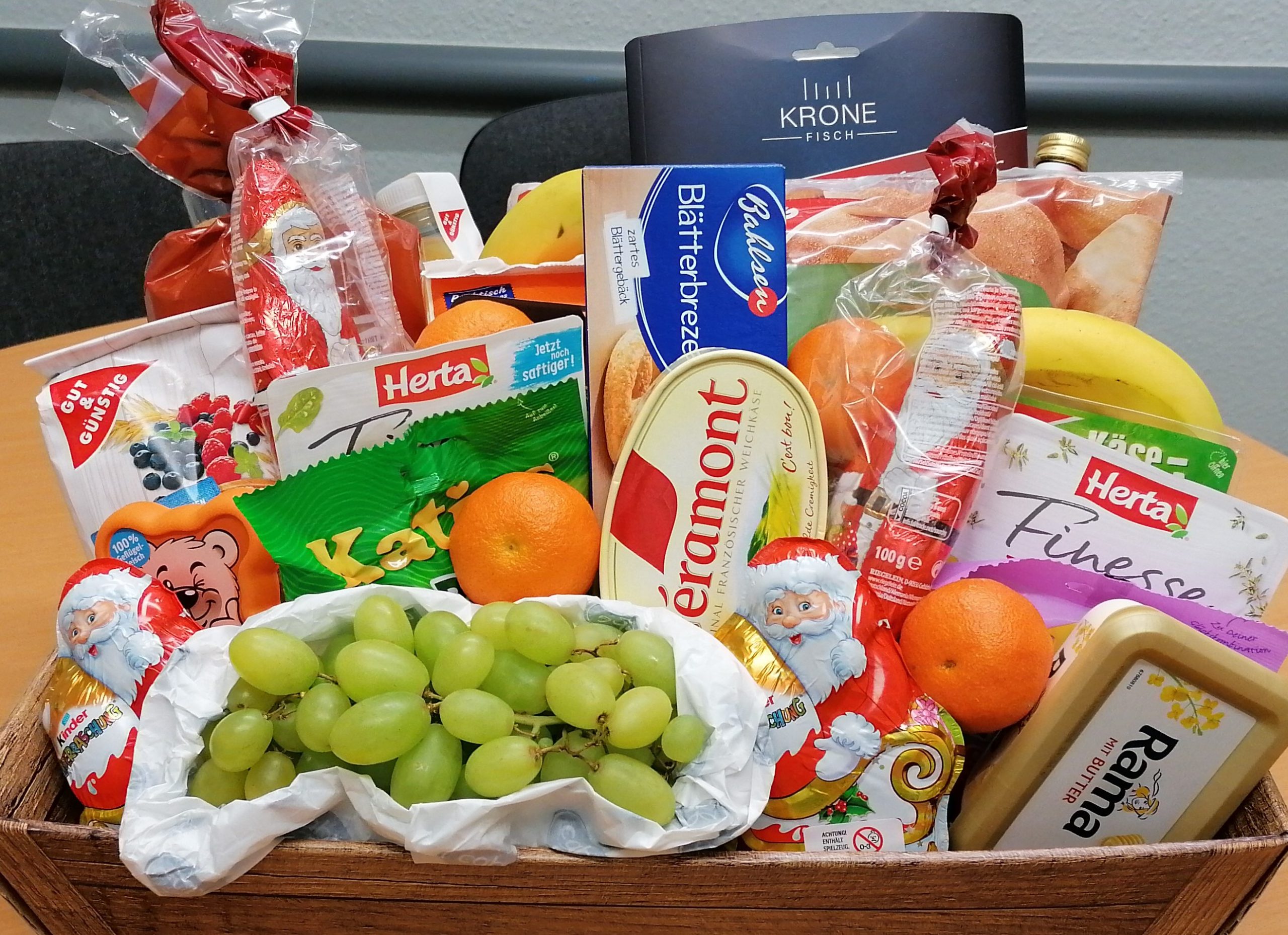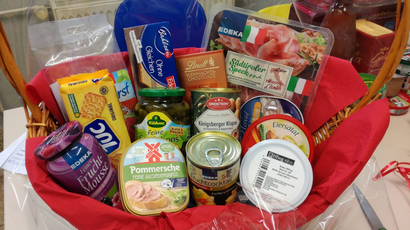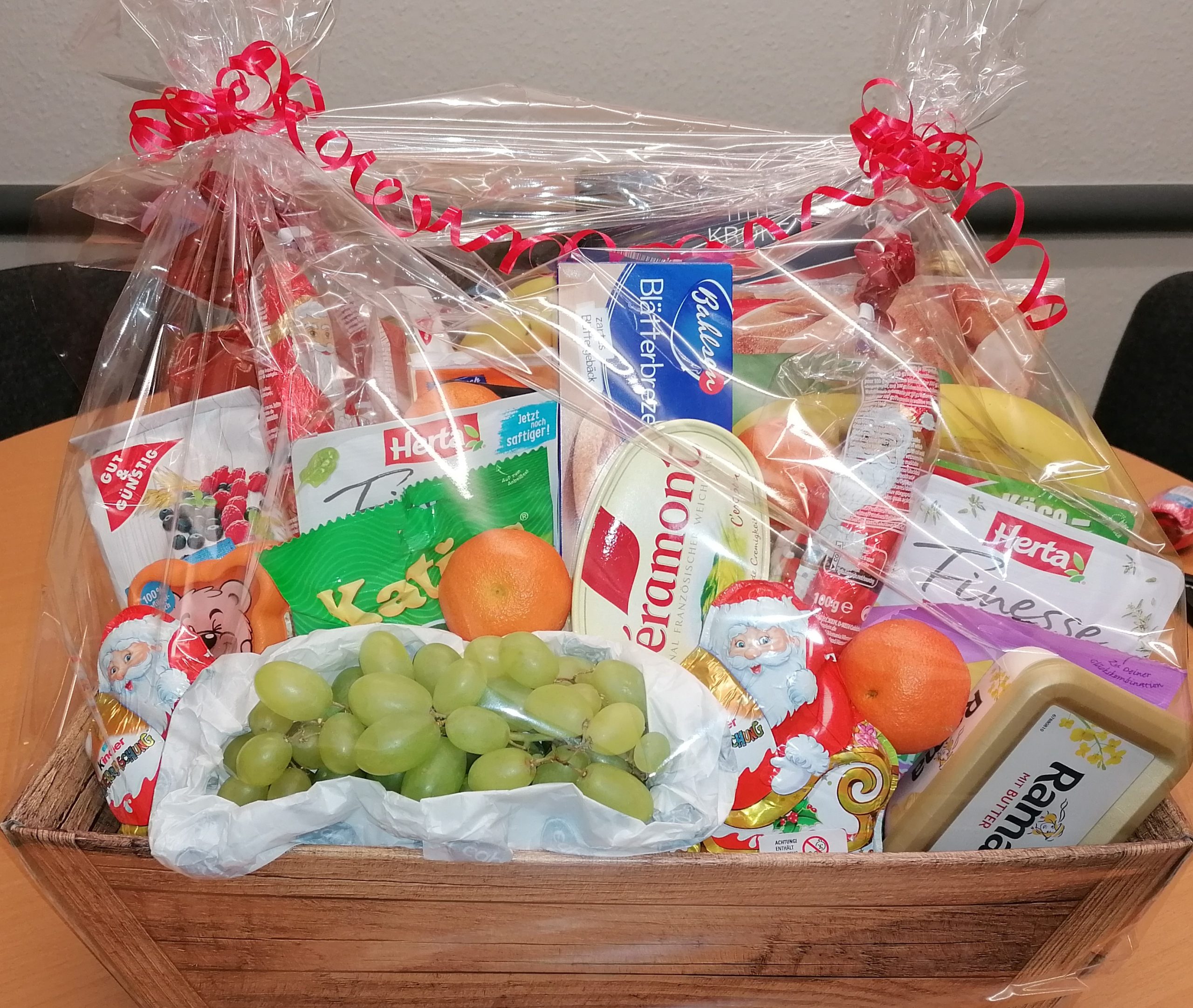 Sie nennen uns ein Thema, um das sich der Inhalt handeln soll und wir suchen aus unserem Sortiment entsprechende Produkte zusammen und dekorieren den Korb. Sie können ihn dann fix und fertig in Geschenkfolie verpackt bei uns abholen.